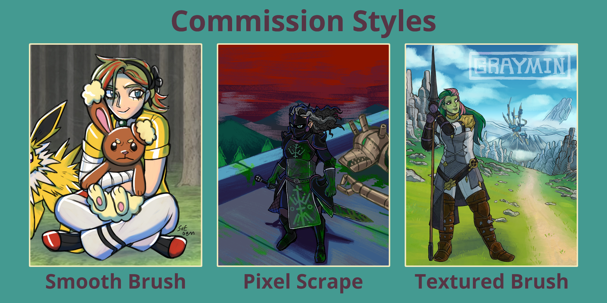 I currently only accept payment through Ko-Fi, Venmo or Paypal. I'm typically able to get one commission done within a week and prefer to work on one commission at a time in an order of first-come-first-served. If you have any additional questions or inquiries, contact me on twitter or through e-mail. Thank you in advance.